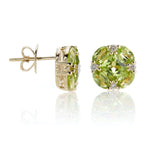 A geometric cluster of peridot and diamonds radiates outward from a single center peridot, creating unique stud earrings in an eye-catching composition.