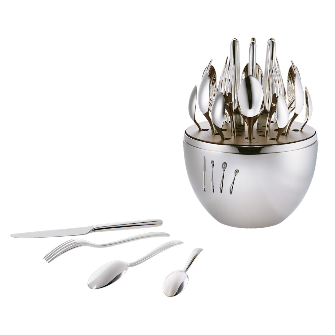 Designed for informal dining moments, Mood Easy is a highly portable set featuring cutlery for life's sweet & savory moments. Sized to be used for smaller meals like breakfast, tapas, brunch, luncheons and more, the silver-plated flatware set can be conveniently transported to a breakfast table, a picnic, a yacht — or wherever a meal will be shared. The egg-shaped storage case is made of mirror-polished stainless steel with a walnut base interior. Founded in Paris in 1830, Christofle has revolutionized the styles and techniques of stainless steel. The brand’s rich heritage reflects major artistic movements and seeks out artists, sculptors and designers to create extraordinary pieces and collections.