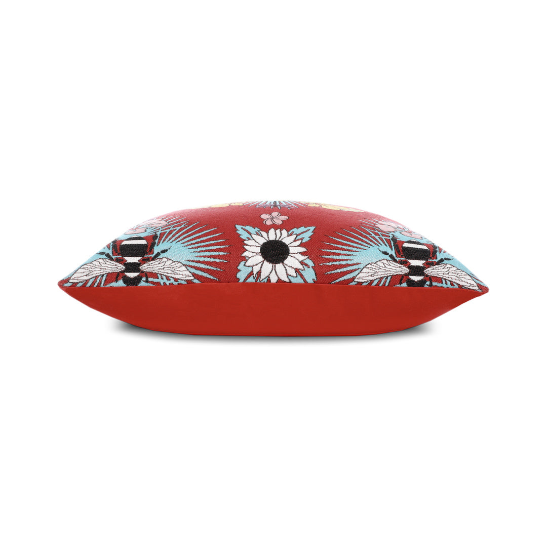 Intricately woven with richly textured yarns and chenille accents, this pillow's stylized pattern layers tropical flora with symmetrical precision and couture-like flair. The result is bold yet elegant — a statement piece that balances graphic impact with elevated craftsmanship.