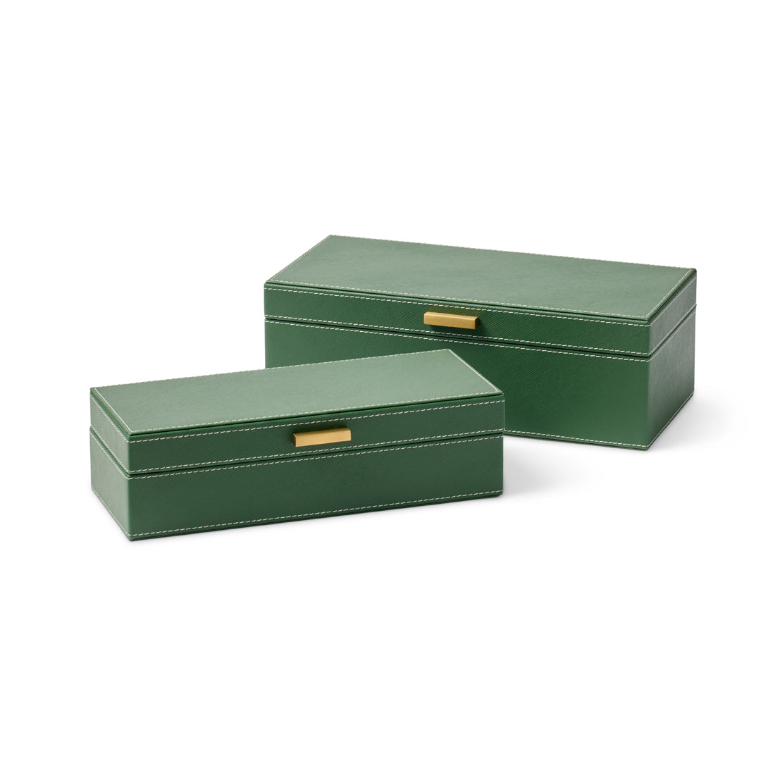 Sleek and structured, these hand-finished leather boxes bring tailored elegance to desktops, dressers or shelves. The rich green tone, paired with contrast stitching and gold-toned pulls, gives the set its refined, utilitarian charm.