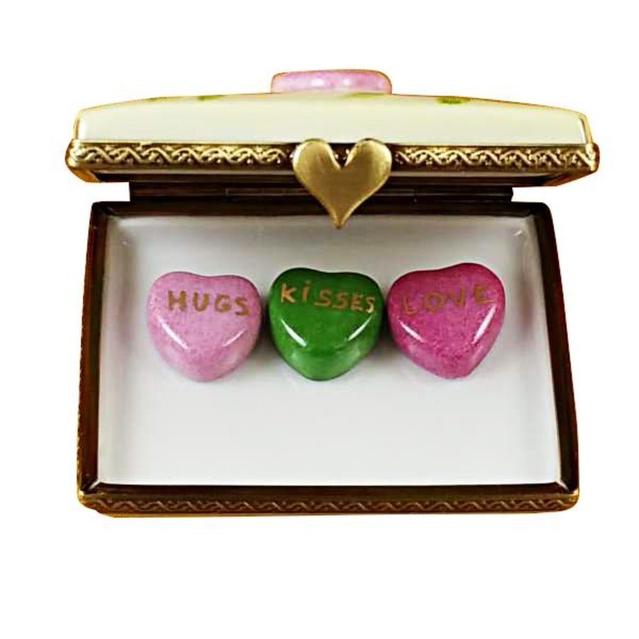 Limoges boxes come in an array of shapes and designs — from the witty and fanciful to the elegant and refined. Made from the pure white porcelain that’s produced only in Limoges, France, this diminutive collectible is crafted and painted by premier artists using techniques that date back to the 17th century. Topped with a porcelain heart that reads 'For You,' the box opens to reveal three removable porcelain conversation hearts, each painted with a romantic word.