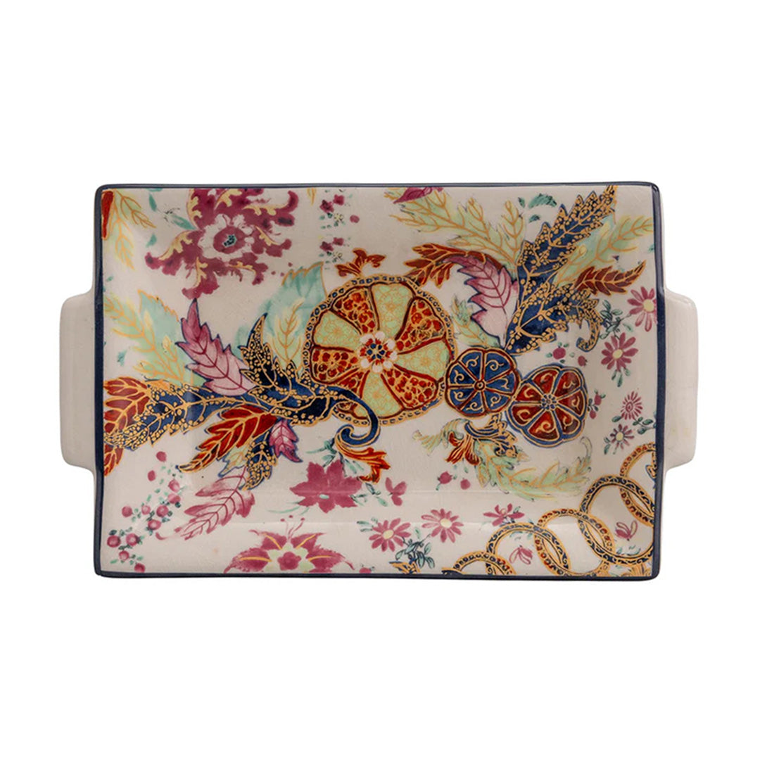 A pattern with centuries of admirers, the tobacco leaf motif traces its origins to 18th-century export porcelain prized for its vibrant color and botanical detail. This rectangular tray reinterprets the richly layered design — featuring stylized hibiscus blooms and pomegranate flourishes — and is equally at home corralling keys in the entryway or serving as a decorative catchall in the powder room.