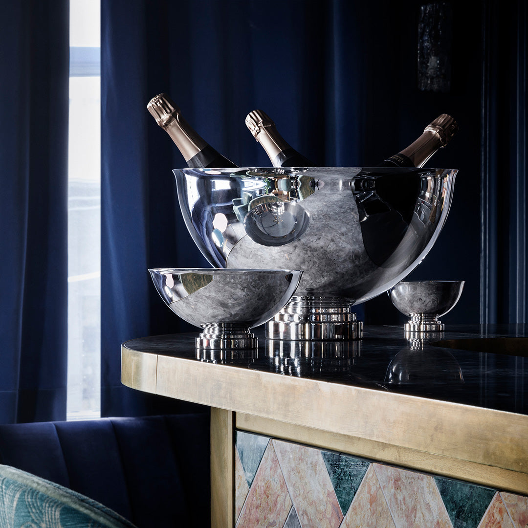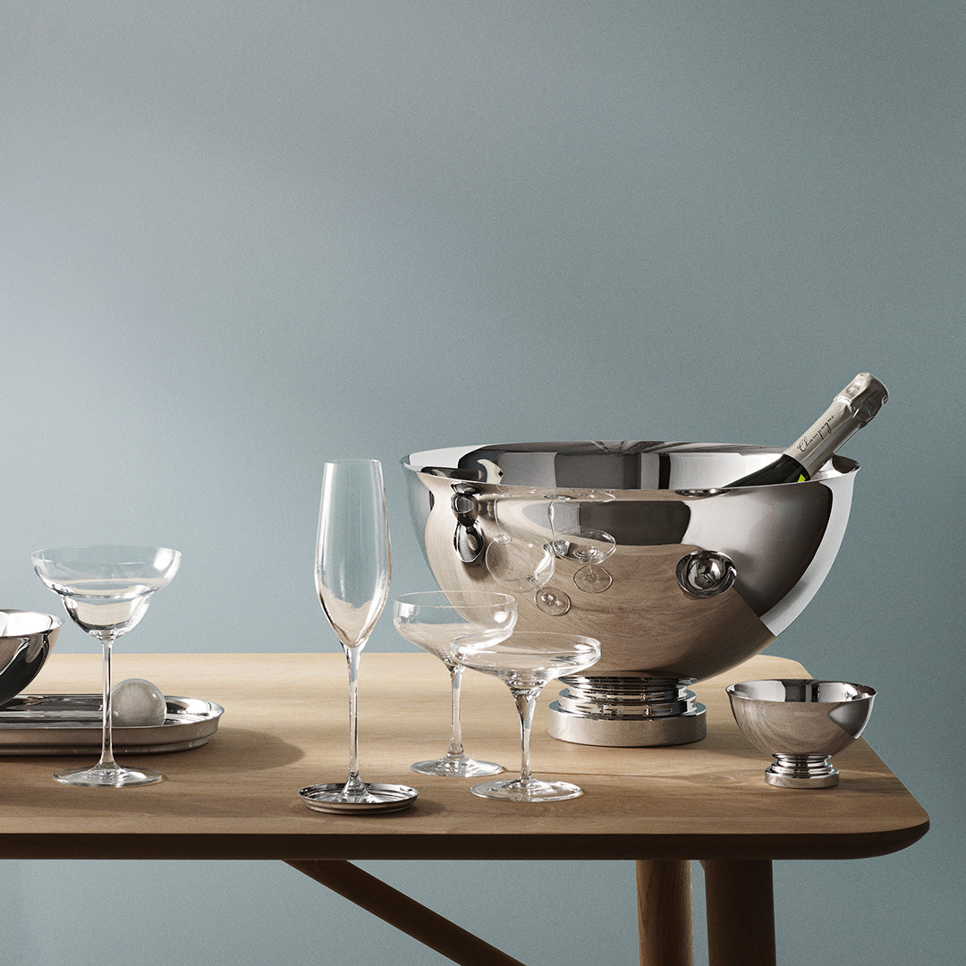 Raise the bar — literally and figuratively — with this striking champagne bowl from Georg Jensen’s Manhattan collection. Inspired by the opulence of Art Deco and the charm of Gatsby-era New York, it channels a time when cocktails were crafted and parties were properly dressed. The silhouette is bold yet refined: sleek, symmetrical curves rendered in mirror-polished stainless steel, elevated on a weighted base that exudes quiet strength. Designed to hold champagne, rosé or white wine over ice, it brings both function and flourish to a well-appointed bar or celebration table.