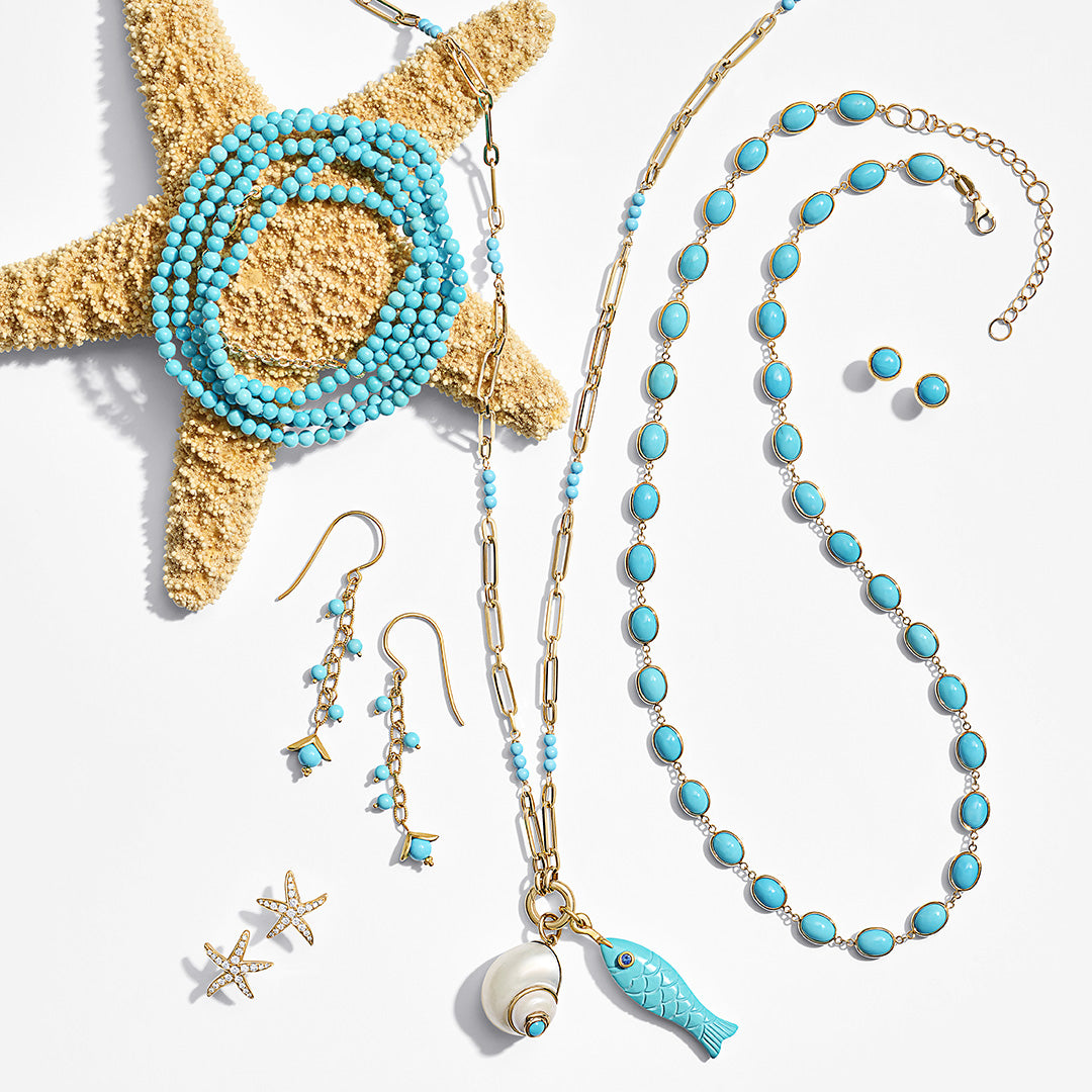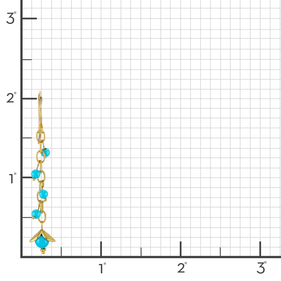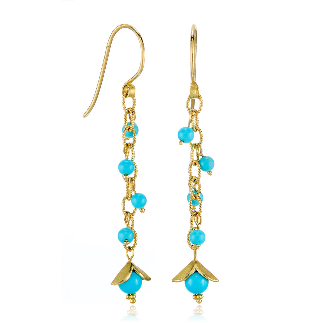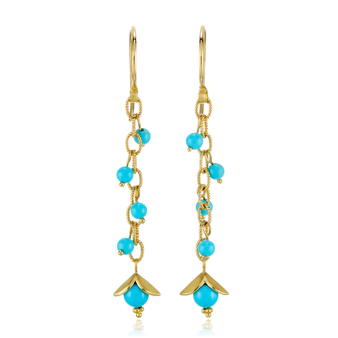 Fine gold links form a fluid cascade, punctuated by vivid turquoise beads that bring a fresh, saturated note of color.