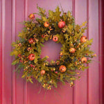 A visual display of fall's natural beauty, our seasonal wreath showcases an abundance of oak leaves accented with rich red pomegranates. The making of artificial flowers is an ancient art that originated in China's Tang Dynasty more than 1,300 years ago. Bountiful arrangements of color and texture, our exquisite greenery is meticulously shaped and painted by hand to perfectly mimic nature’s beauty.