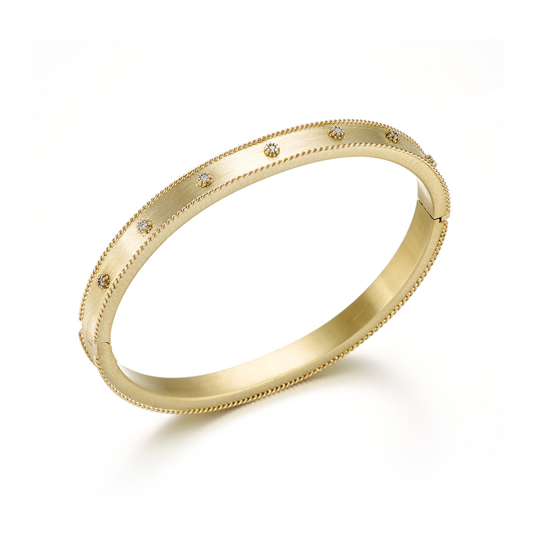 It's all about the details with this eye-catching hinged bangle — from the brushed gold surface and braided edges to the accents of shimmering diamonds. Since 1861, Gump's has been a destination for jewelry that is distinctive and timeless. Featuring only the finest materials, each piece is a statement of elegance.