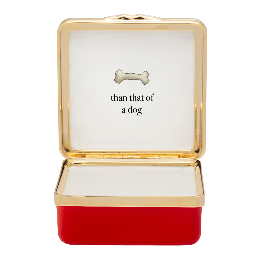 Delight dog-loving friends with a perfect piece for storing small trinkets and treats alike. Handmade in the heart of England, this tail-waggingly charming enamel box features 'No greater friendship exists' on the lid and 'than that of a dog' inside, making it a gift sure to be cherished for years to come.