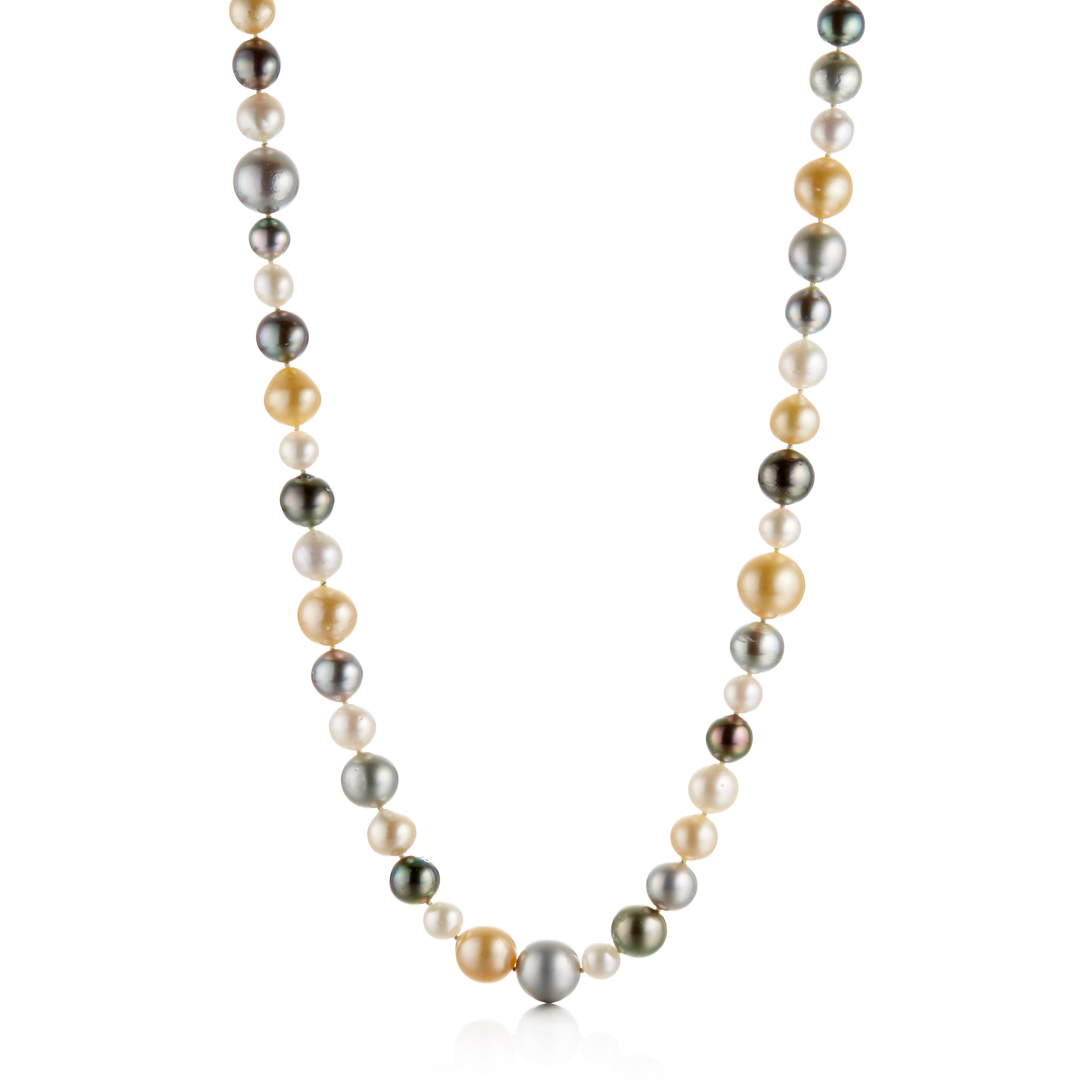 An extraordinary long necklace of multi-color Tahitian and South Sea pearls finished with an 18-karat yellow gold clasp. Simple statements of elegance, pearls have been a mainstay in Gump's fine jewelry assortment for decades. Revered for their alluring luster and classic beauty, they are widely recognized as symbols of purity, integrity and wisdom gained through experience.