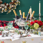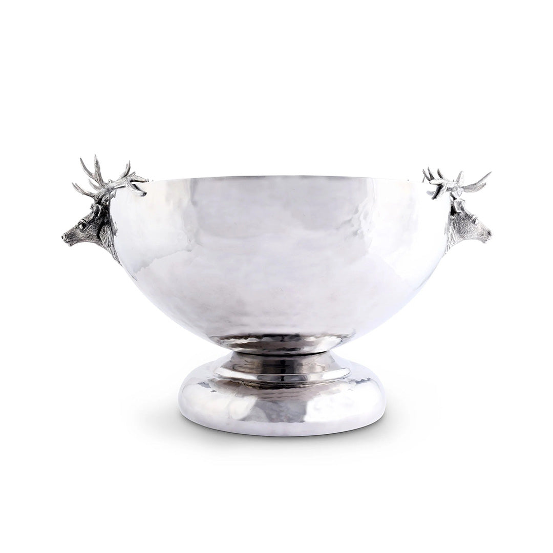Blending rustic grandeur with refined craftsmanship, this ice tub makes a striking centerpiece for festive gatherings. Its gleaming, hand-hammered stainless steel basin rests on a sturdy footed base, while two intricately detailed pewter elk heads — each crowned with a full rack of antlers — add a dramatic touch. Generously sized to hold multiple bottles of champagne or beer, it’s as functional as it is show-stopping, bringing a sense of mountain lodge elegance to holiday entertaining.