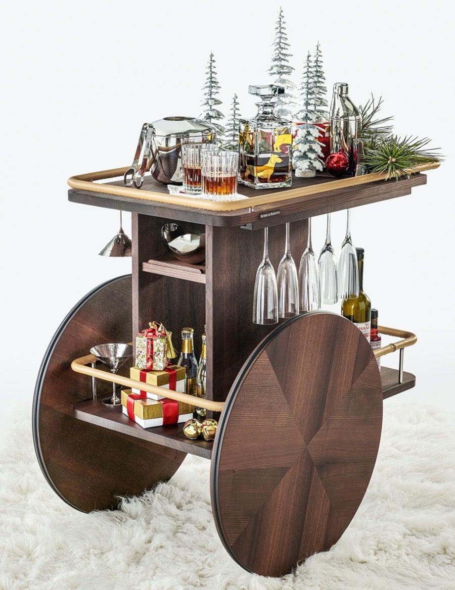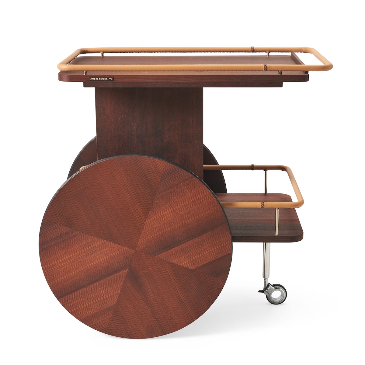 The double-decker serving trolley enthroned on large wheels is crafted by the Robbe & Berking master boat builders in the company's own shipyard. Handcrafted of FSC-certified thermo ash wheels and body, and a stainless steel railing covered with nappa leather. Whether decorated with art books or fine whiskey, skillfully sets the scene and becomes the topic of conversation at every event.