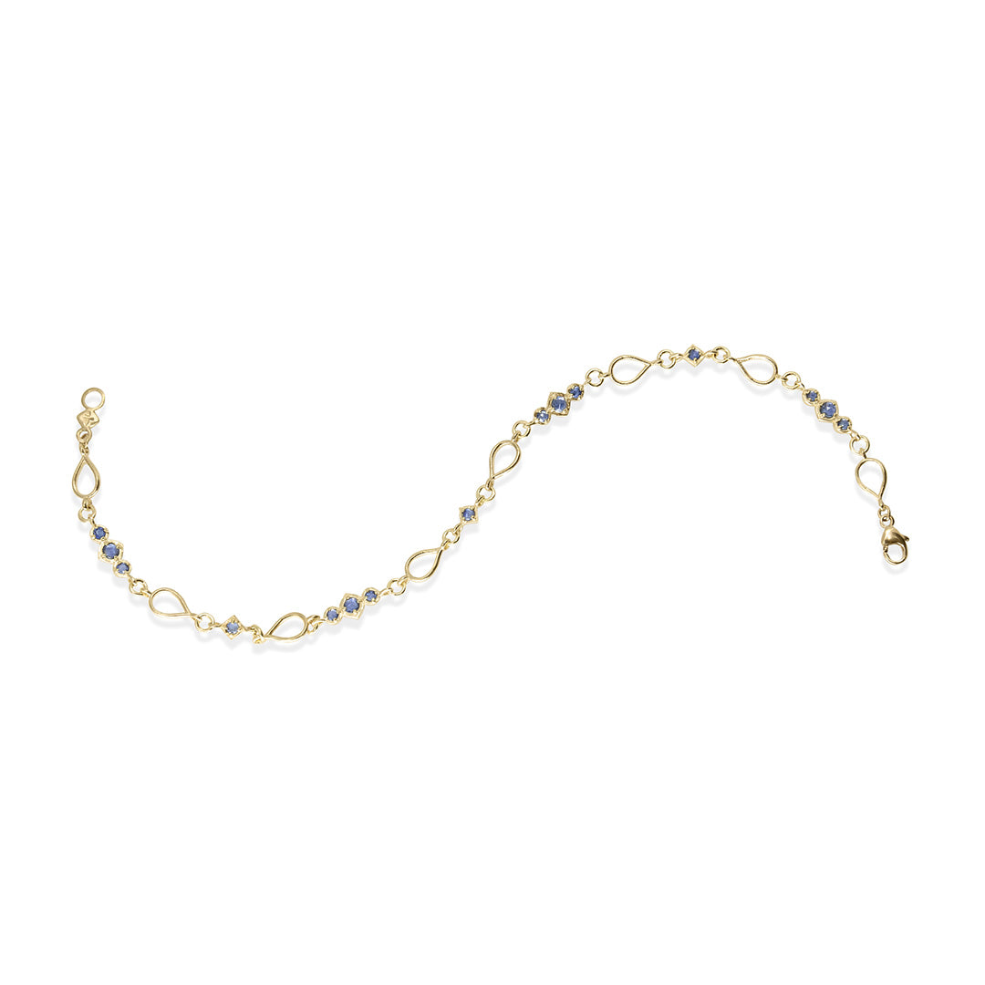 A distinctive gold bracelet featuring airy, lacy stations that lend a sense of lightness and grace. Adorned with double-sided rose-cut sapphire accents, each stone catches the light from every angle, adding a soft, celestial shimmer to this elegant design.