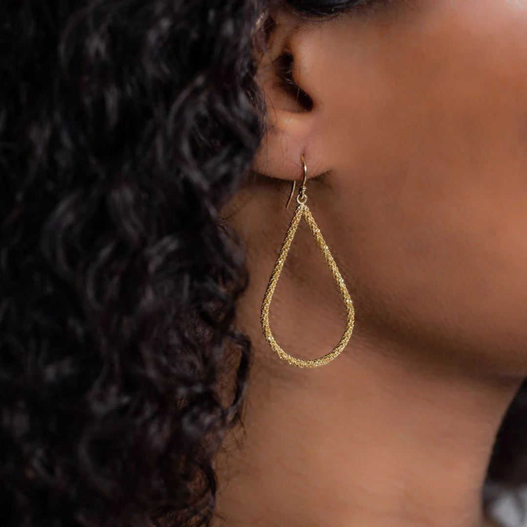 Slender whispers of handwoven gold, these light and lovely earrings play with negative space to make a compelling statement. Each elegant open teardrop is meticulously crafted from diamond-cut 18-karat yellow gold chain for a richly textured effect that will shimmer in even the softest light.