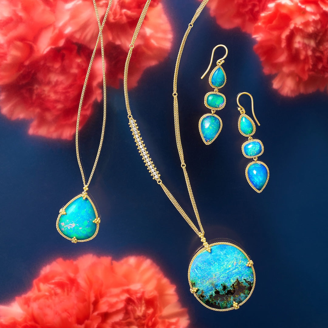 A pear-shaped Ethiopian opal glows with shifting hues of blue and green, embraced by a twisted gold frame. Detailed clusters at each prong add a sculptural flourish, enhancing the pendant necklaces’s organic beauty.