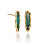 These earrings feature elongated green tourmaline teardrops, gracefully framed by a golden weave, capturing the essence of classic elegance with a distinctive twist.