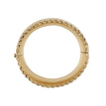 This wide 14-karat gold bangle from the 1950s is detailed with a softly brushed surface accented by engraved leaf-like motifs. Finished with twisted rope edging, it carries the bold yet feminine character of mid-century goldwork.