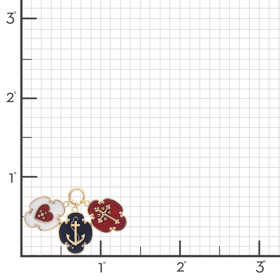 Three symbolic charms—anchor, heart and crossed arrows—represent faith, love, and hope in richly enameled gold. Each piece combines color and meaning, designed to be worn together as a personal emblem or layered with other favorites.