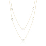 A delicate gold chain link necklace with alternating white topaz gemstones.