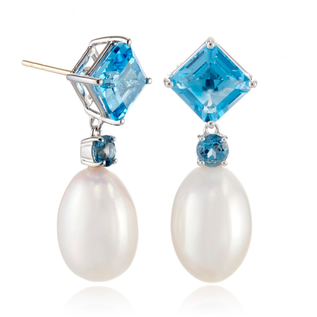 Featuring a striking duo of Swiss and London blue topaz above elegant white freshwater pearls, these earrings present a vibrant cascade of color with a refined finish. Since 1861, Gump's has been a destination for distinctive jewelry that offers a lifetime of enjoyment. To ensure each piece is created to our exacting standards, our expert in-house jewelry team oversees every step of the production process. The result is a statement of pure elegance.
