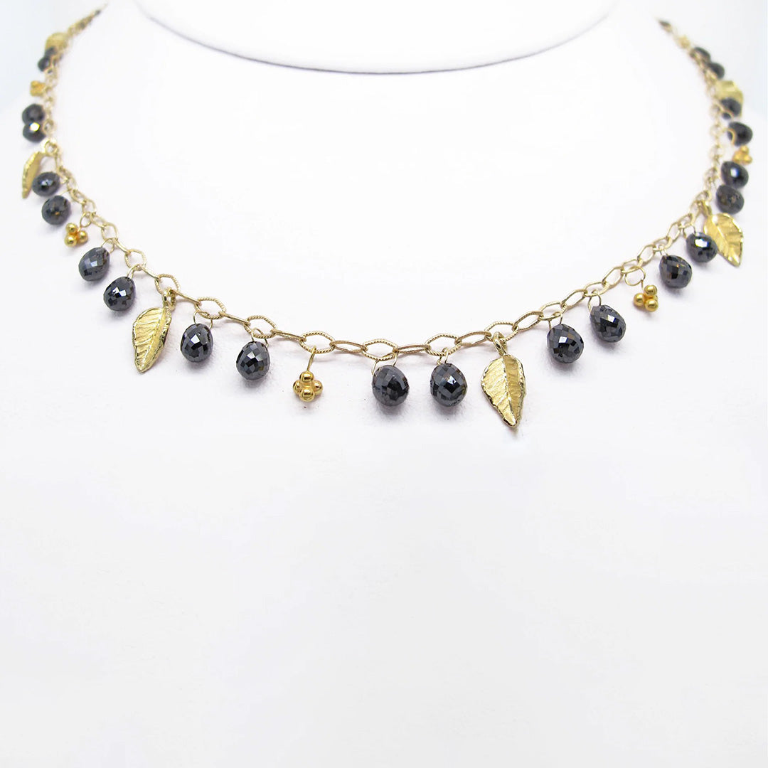 Faceted black diamond briolette drops are accented with gold wavy leaves on this twisted link chain necklace.