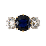 A classic three-stone composition centers on a richly saturated sapphire, flanked by old-cut diamonds that add balance and presence. Platinum and gold work together in a traditional setting that highlights the scale and character of each stone without excess.
