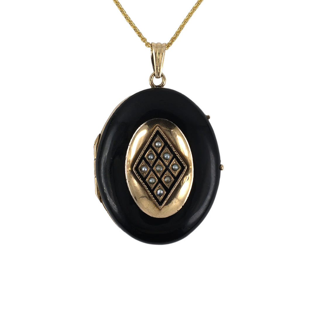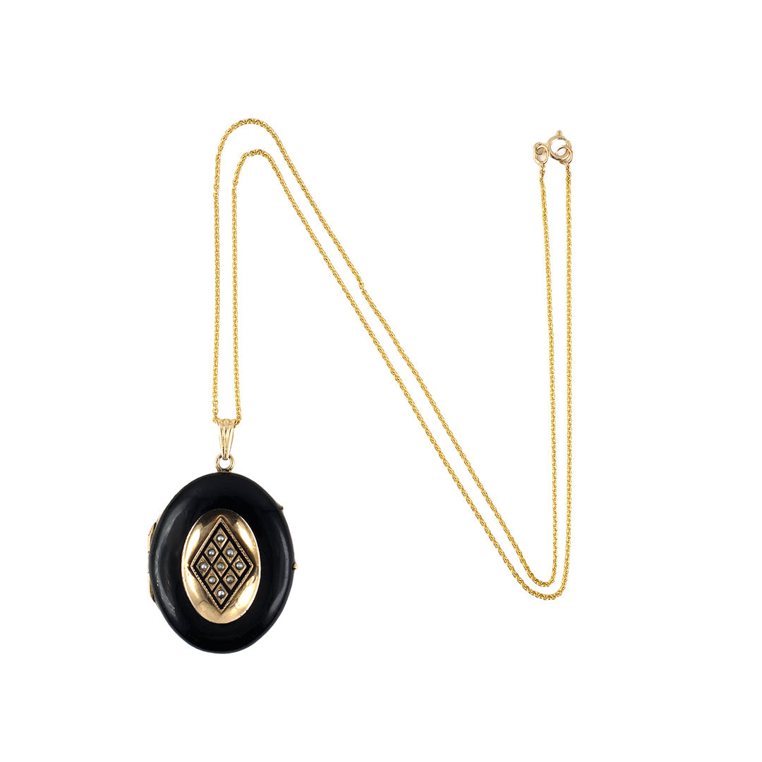 A poetic memento from the 1860s, this antique locket speaks volumes in its silence. Its oval silhouette is encased in glossy black enamel and crowned with a lozenge of seed pearls, framed in gold. The hinged locket opens to reveal space for two portraits or cherished keepsakes — an intimate detail that captures the sentimentality of the era.