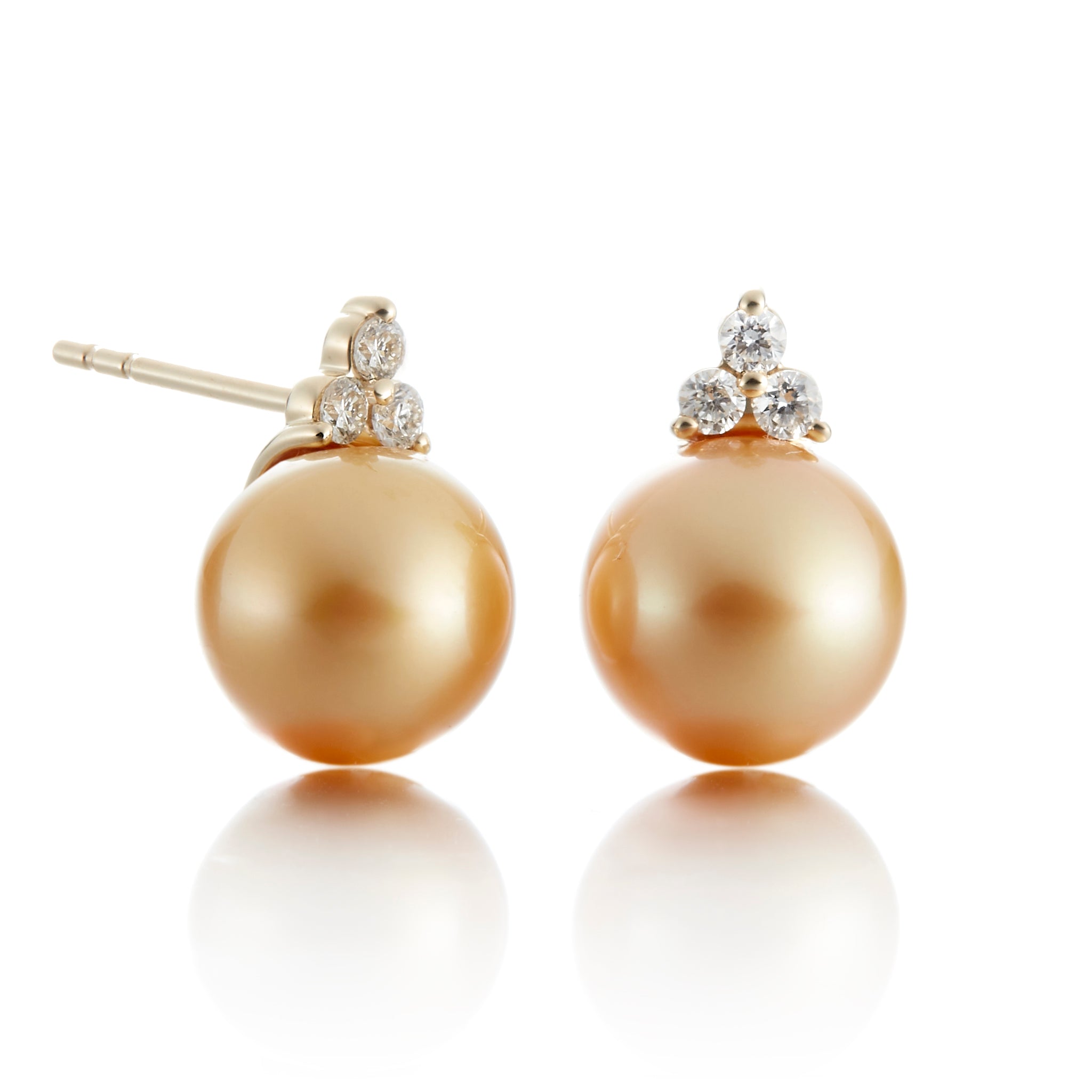 Creating a harmonious blend of timeless beauty and modern-day sophistication, these gold earrings pair luminous golden South Sea pearls with a trio of shimmering diamonds. Simple statements of elegance, pearls have been a mainstay in Gump's jewelry assortment for decades. Revered for their alluring luster and classic beauty, they are widely recognized as symbols of purity, integrity and wisdom gained through experience.