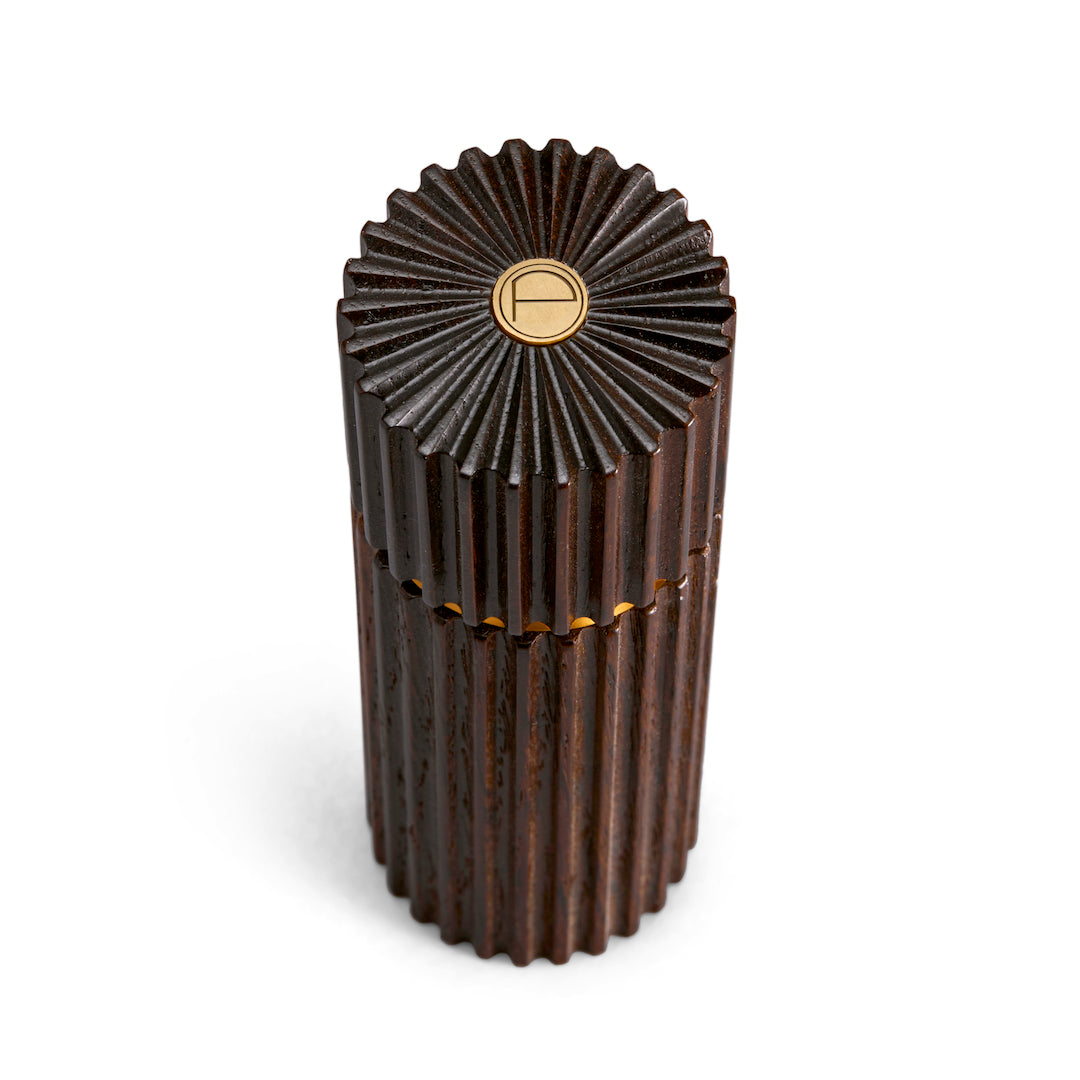 The modern, sleek silhouettes of these salt and pepper mills will turn seasoning your food into unmistakably chic event. Hand-carved in Portugal of smoked oak, they're adorned with handsome brass details and are expertly outfitted with high-quality metal grinding mechanisms.