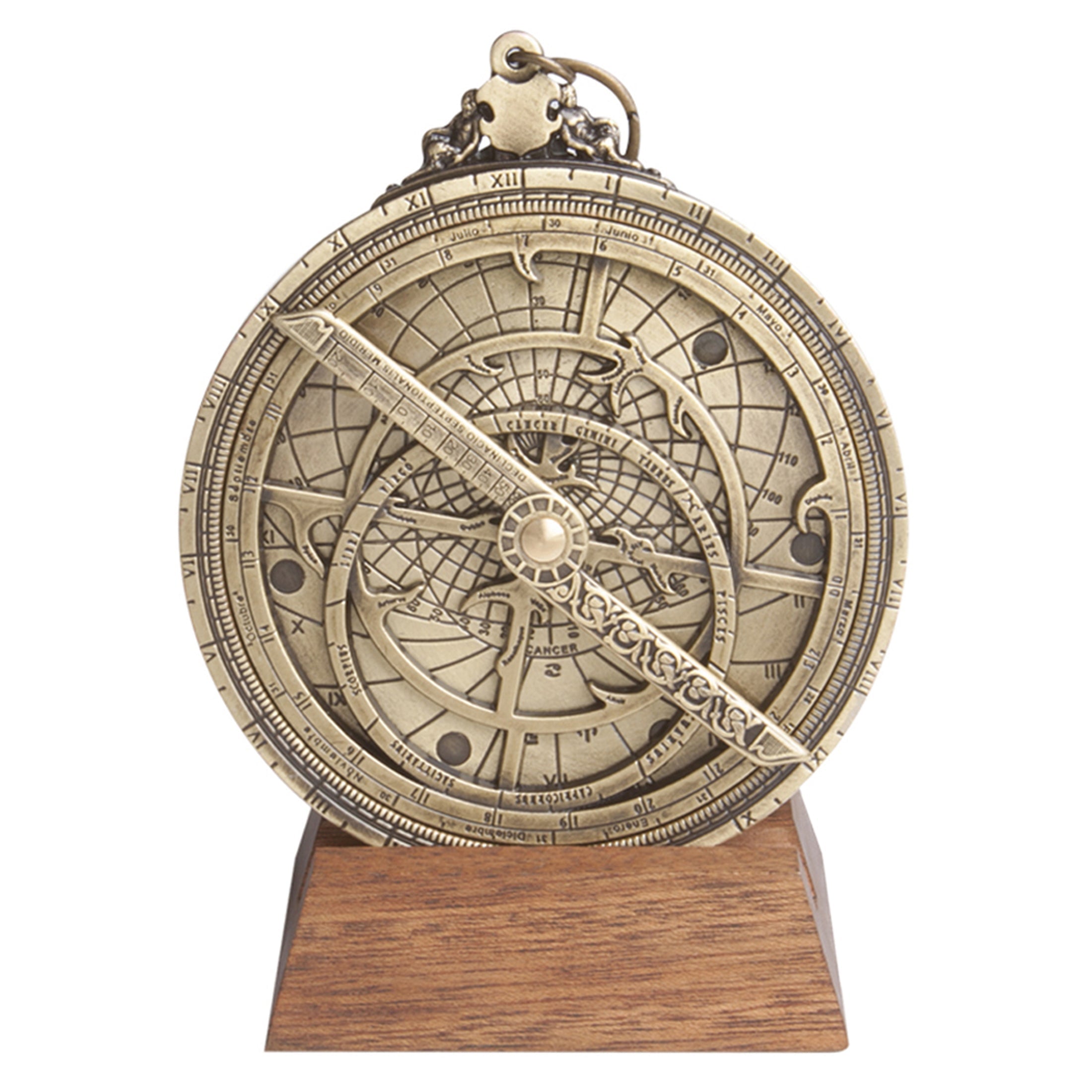 Modeled after an early astronomical instrument thought to have been designed in ancient Greece, this working, brass-plated astrolabe replica makes a striking statement displayed on a desk or library shelf. The principles of the astrolabe—used to study the stars at a particular time and place—were used for hundreds of years before newer technologies took their place. Infused with scientific history, this decorative device will delight any card-carrying astronomy geek or instrument aficionado.