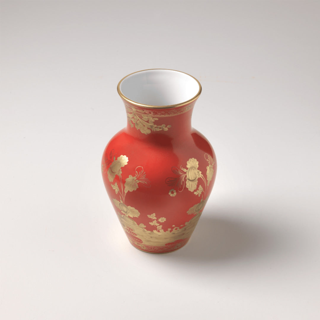 Designed by Gio Ponti in 1946, the Oriente Italiano collection brings together elements of East and West to brilliant effect. Stylized garofani, or carnations, blossom on handcrafted porcelain in a palette of gold and a rich red.