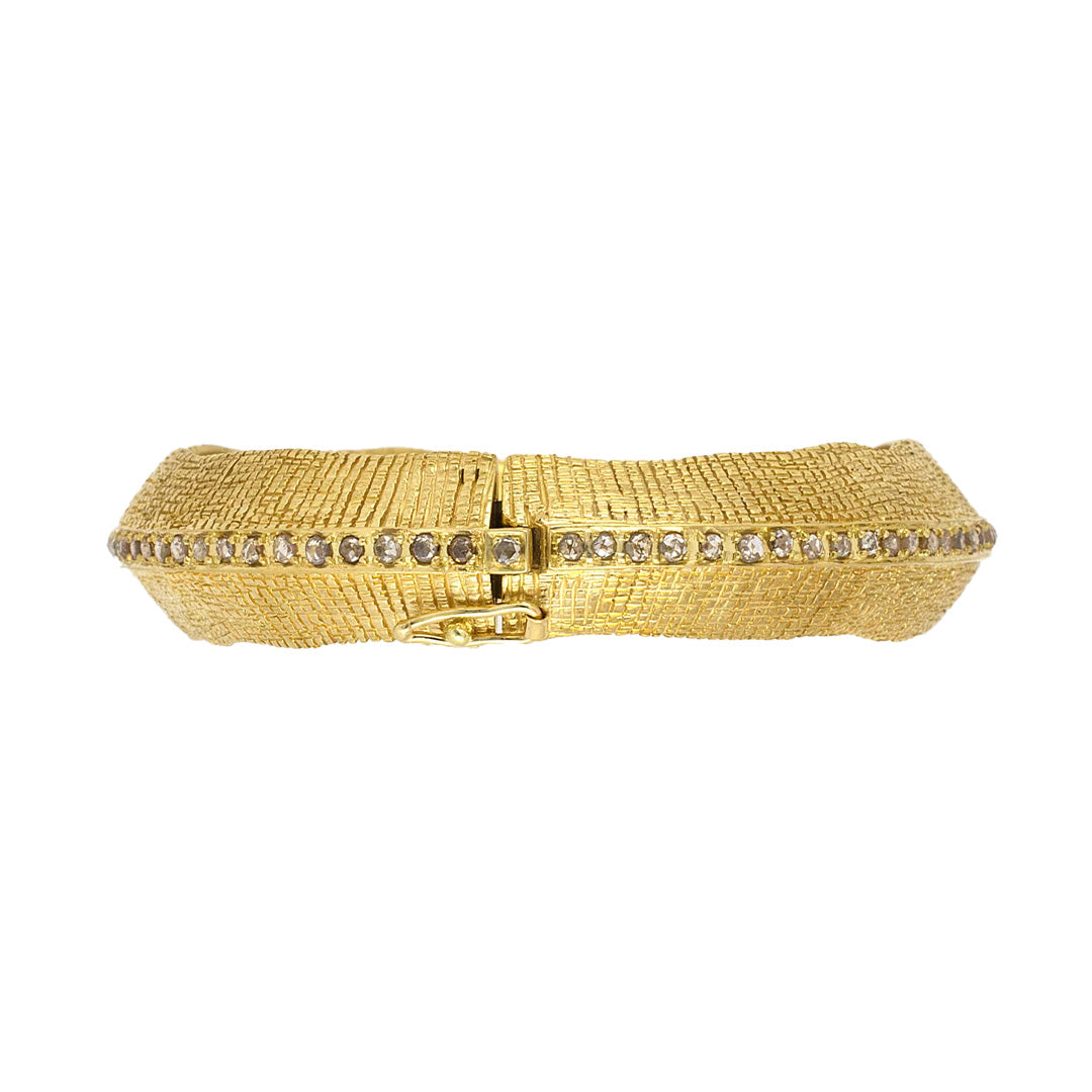 A seamless fusion of texture and radiance, this handcrafted gold Diamond Row bangle showcases Coomi’s signature artistry. A row of rose-cut diamonds runs through the center, adding a luminous contrast to the carved gold surface, while the hinged design ensures a comfortable fit. Gump’s is forever treasure hunting for the best of everything and our collection of estate jewelry — featuring rare antique pieces — is no exception. Distinguished in provenance, each item is one of a kind, reflecting its distinctive gemstones, materials and craftsmanship.