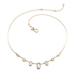 Softly luminous chalcedony cabochons, each encased in warm gold, form a rhythmic composition of organic shapes. With its refined asymmetry and serene palette, this necklace offers a modern interpretation of effortless elegance.