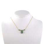 A pear-shaped emerald glows at the center of this platinum and gold pendant, framed by a halo of diamonds and flanked by additional emeralds along the bar. The piece combines delicacy with enduring sophistication.