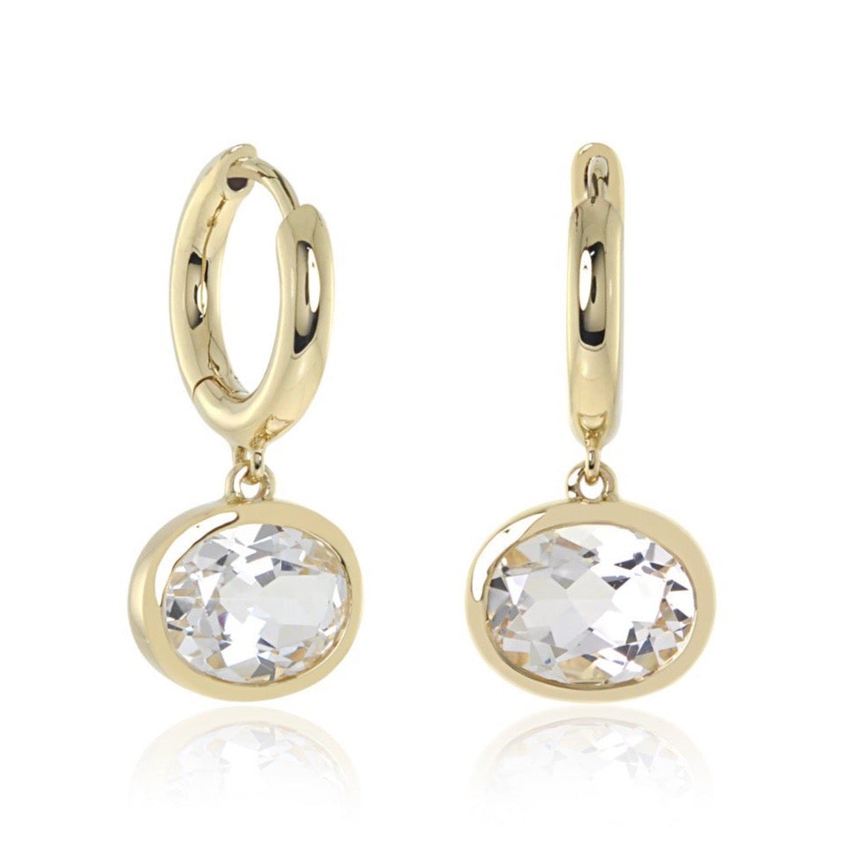 Faceted bezel-set white quartz hang from gleaming 14-karat yellow gold hoops.