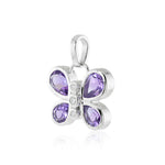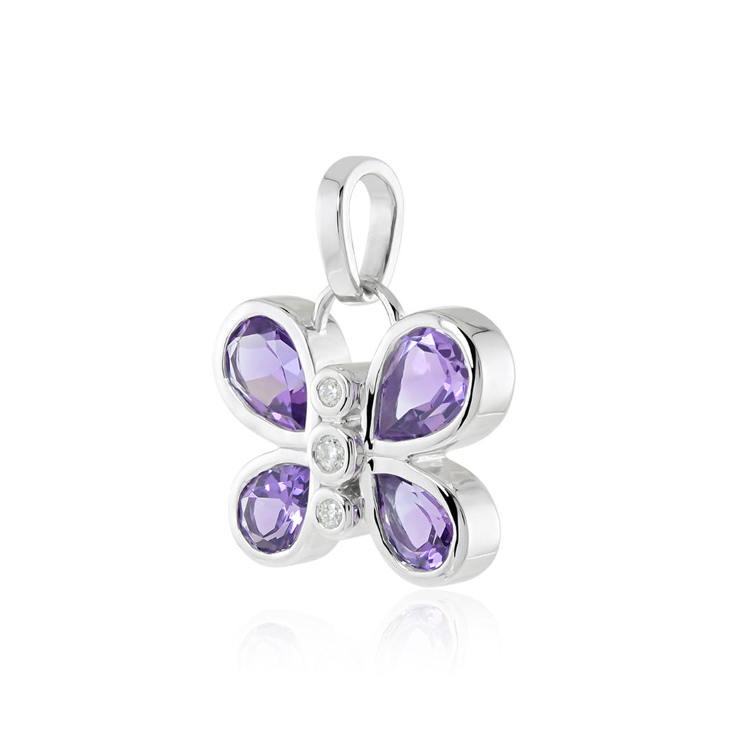 Graceful and vibrant, this butterfly charm is crafted with faceted amethyst wings—each one a rich shade of purple that catches the light with subtle brilliance. A trio of petite diamonds dots the centerline, lending a delicate shimmer.