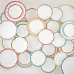 Made of white porcelain and handpainted by master artisans in Hungary, this elegant plate is bordered in raspberry and 24-karat yellow gold. Herend’s porcelain creations feature a signature pattern that dates back to 1858, when a fish-scale decoration inspired a craftsman to create a similar design imitating feathers. 10 1/2" diam.