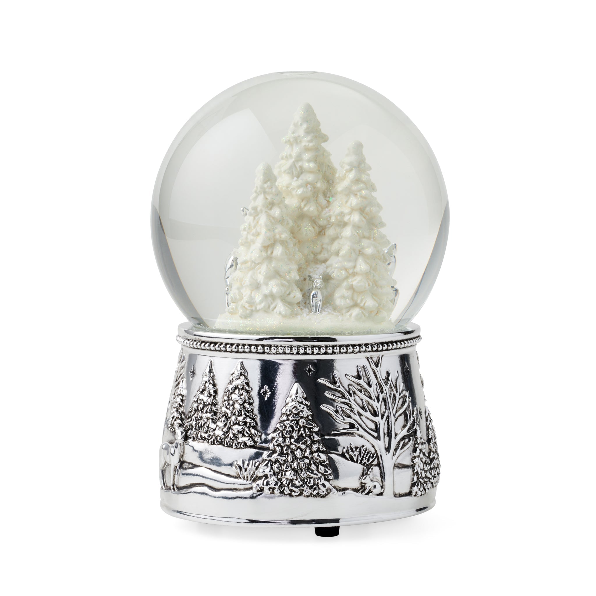In this charming winter scene, a pair of reindeer play near snow-covered trees in this silver-plated snowglobe. A thoughtful piece — and instant heirloom — to give or get this holiday season.