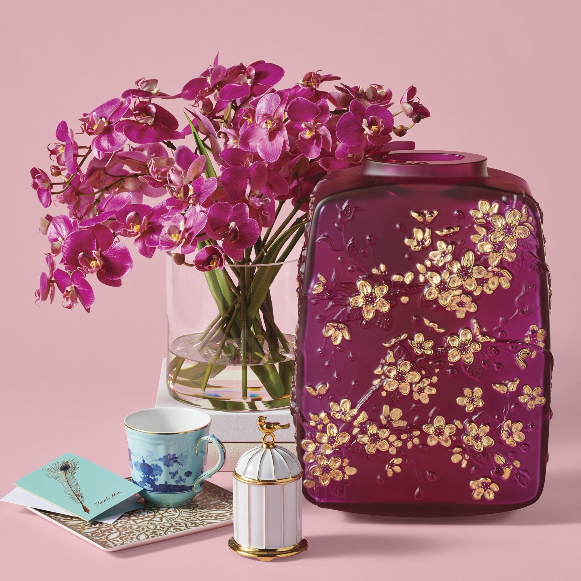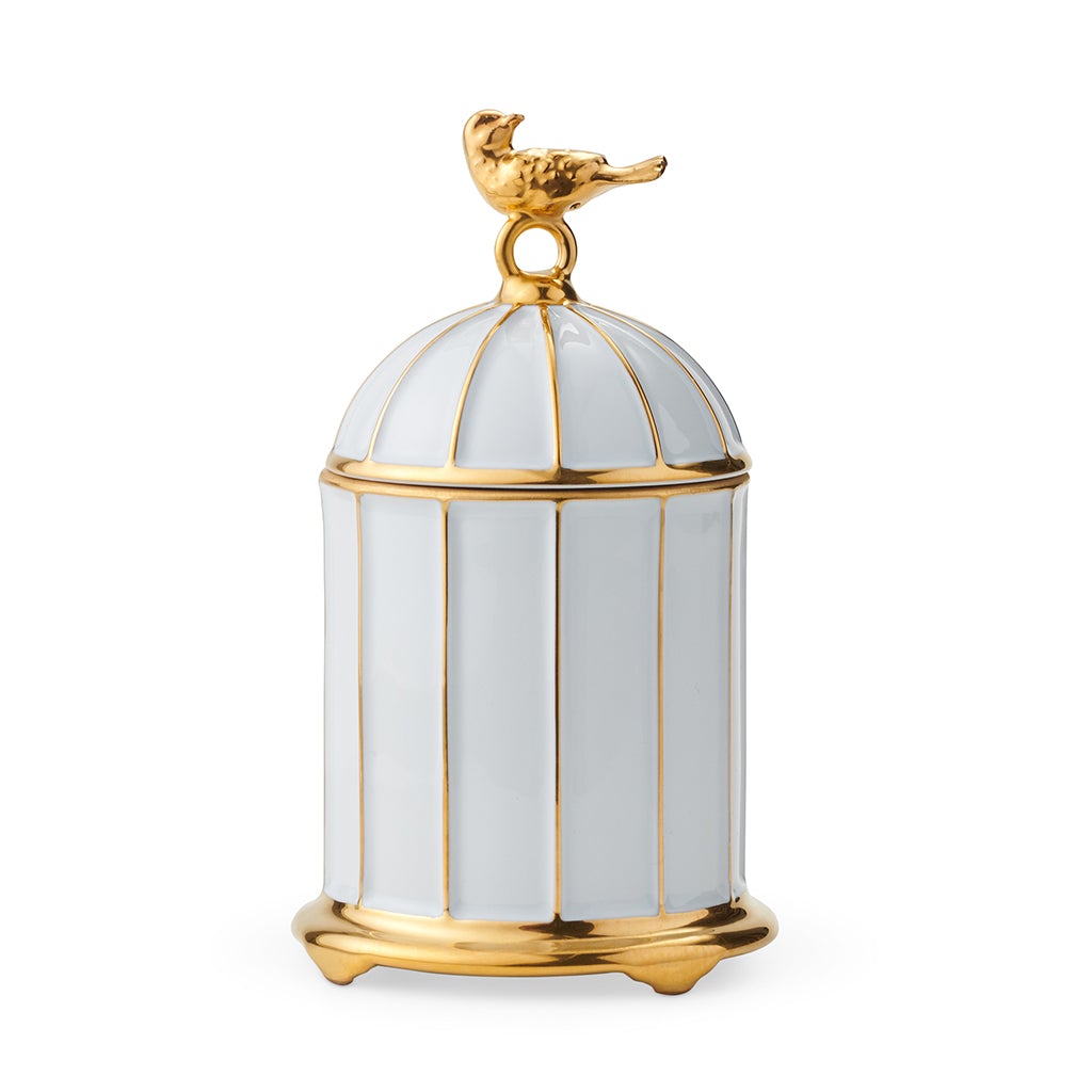 A delicate bird sits atop this pristine, handcrafted Limoges porcelain vessel, finished with 24-karat gold details. Lift the lid to reveal a candle with the intoxicating scent of Pink Champagne.