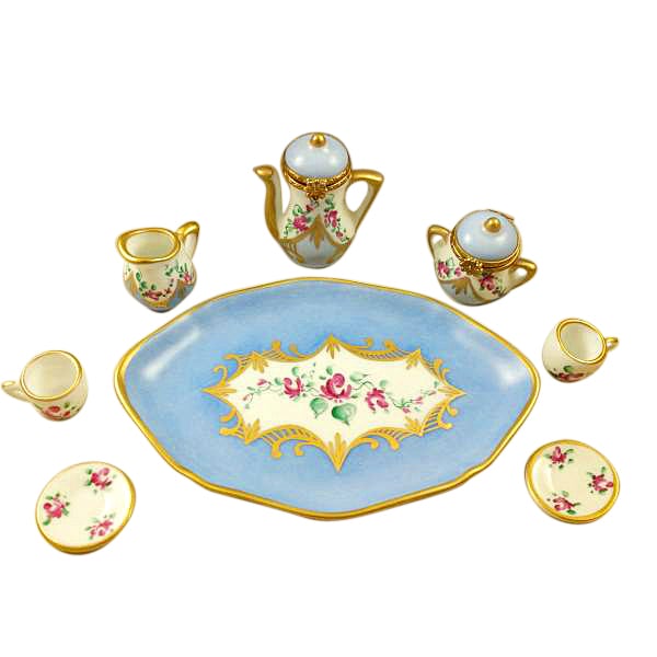 Handcrafted in Limoges, France, with intricate handpainted details, our porcelain collectible makes a delightful gift, no matter what the occasion. Includes one tray with removable tea set: two teacups with saucers, a creamer, a sugar pot, a teapot and one tray. Tray: 4 3/4"L x 3 1/4"W; tallest piece is 2 1/4"H.