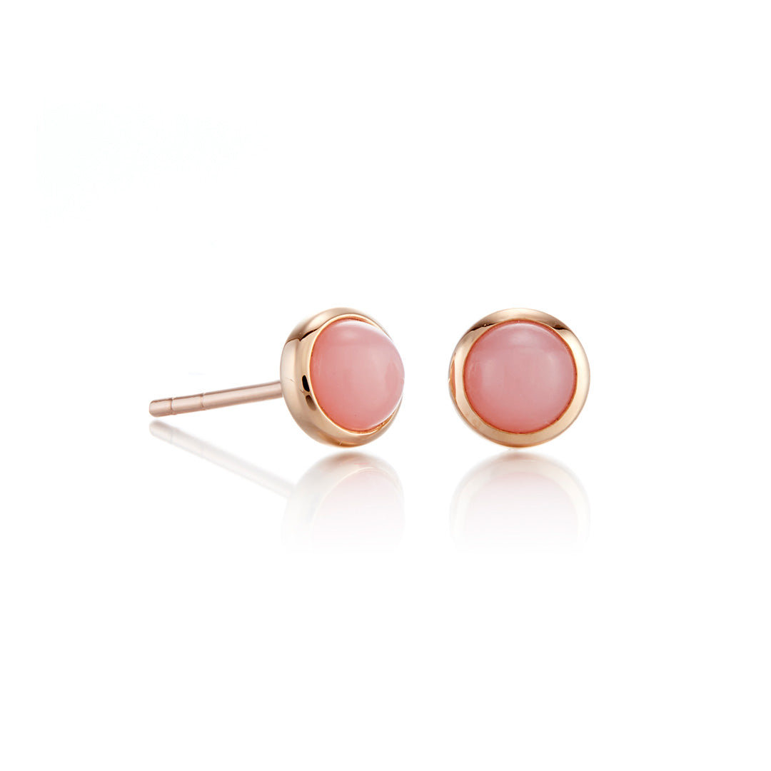 Offering a chic streamlined look, these bezel-set pink opal earrings feature polished round cabochons set in rose gold.