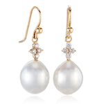 Creating a harmonious blend of timeless beauty and modern-day sophistication, these distinctive drop earrings pair luminous South Sea pearls with a quartet of shimmering diamonds. Simple statements of elegance, pearls have been a mainstay in Gump's fine jewelry assortment for decades. Revered for their alluring luster and classic beauty, they are widely recognized as symbols of purity, integrity and wisdom gained through experience.