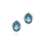 Luminous London blue topaz stones are framed in sleek silver bezels, emphasizing their vivid hue and graceful oval shape. The clean, modern setting lets the natural beauty of each gemstone take center stage.