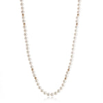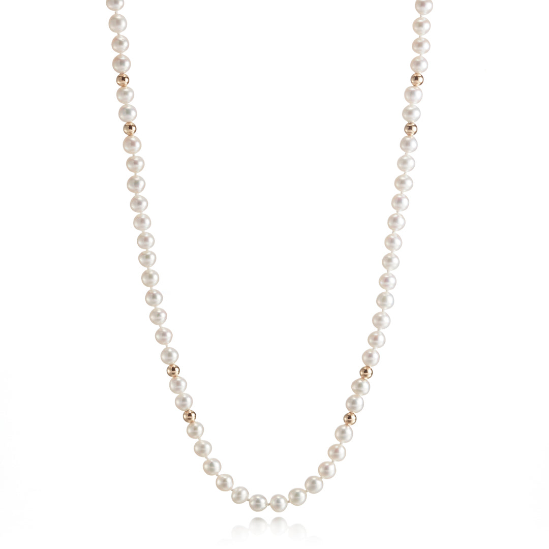 A long rope necklace of white freshwater pearls punctuated with gold ball accents. Simple statements of elegance, pearls have been a mainstay in Gump's fine jewelry assortment for decades. Revered for their alluring luster and classic beauty, they are widely recognized as symbols of purity, integrity and wisdom gained through experience.