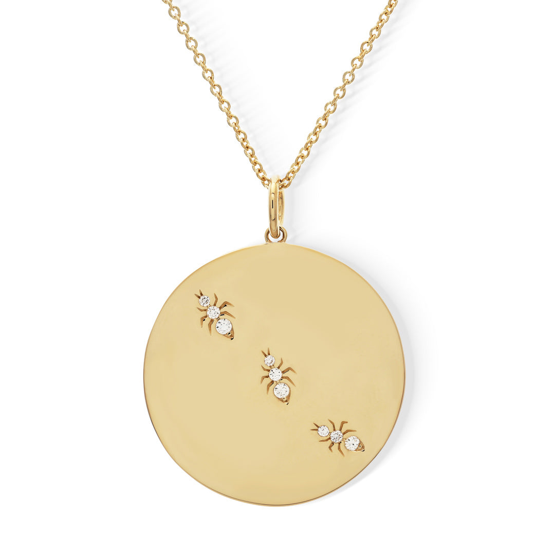 A smooth gold disc becomes the backdrop for a playful detail — three tiny ants, each set with diamonds, moving in a quiet line across the surface. It’s an unexpected motif that adds personality, making it an easy conversation starter you can wear every day.