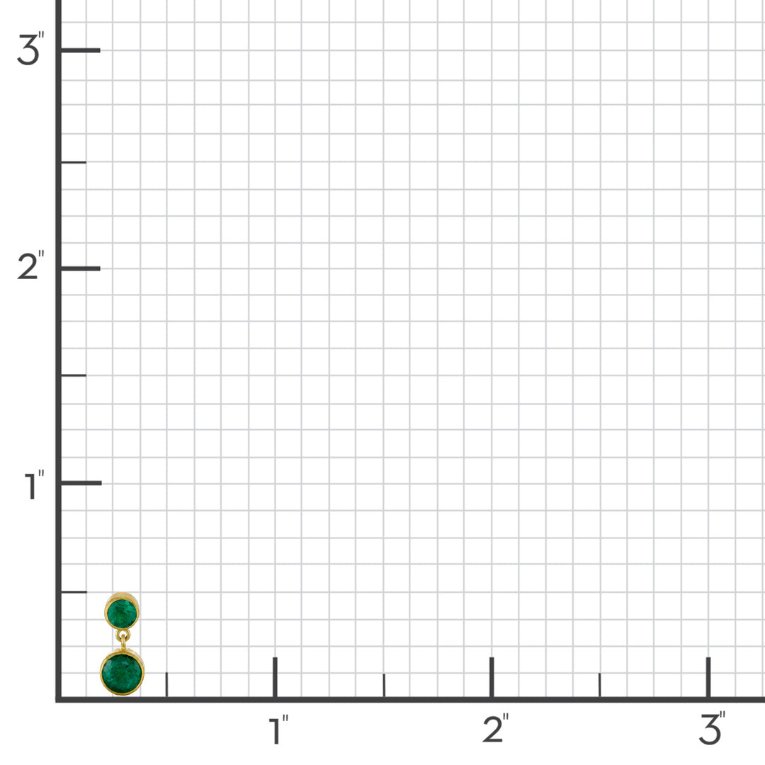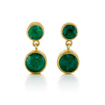 Rich Zambian emeralds are presented in paired round drops, their deep green tones accented by subtle natural inclusions. Brushed gold settings lend a soft, matte contrast, giving the composition its artisanal character.