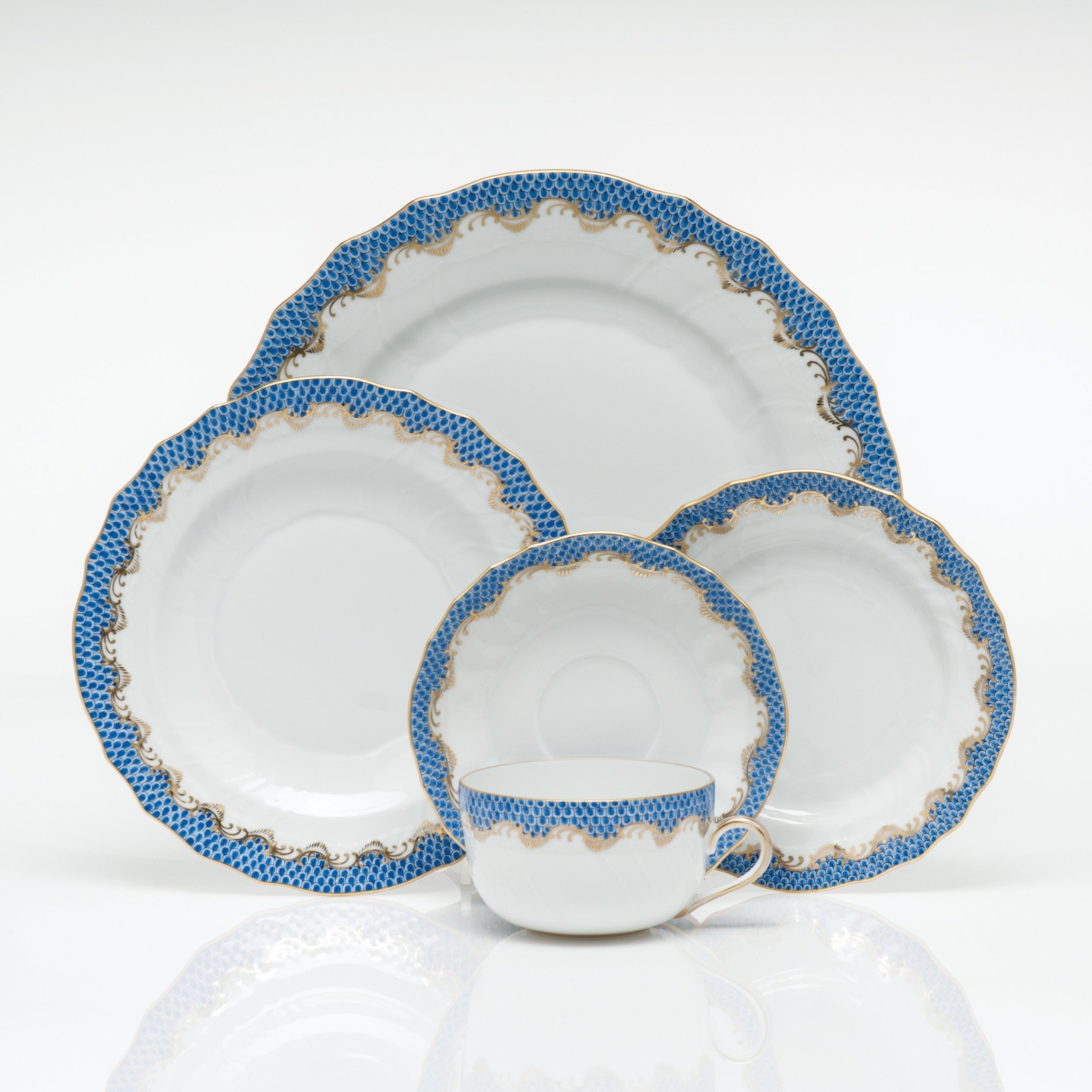 Made of white porcelain and handpainted by master artisans in Hungary, this elegant saucer is bordered in blue and 24-karat yellow gold. Herend’s porcelain creations feature a signature pattern that dates back to 1858, when a fish-scale decoration inspired a craftsman to create a similar design imitating feathers. 5 1/2" diam.