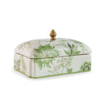 With its exotic floral and fauna design, this extraordinary porcelain box features a green adaptation of a classic Indian chintz pattern. Its name refers to Catherine of Braganza, the queen of King Charles II of England, who brought Portuguese trade routes to the British East India Company, spurring fascination with Asian goods and fabrics.