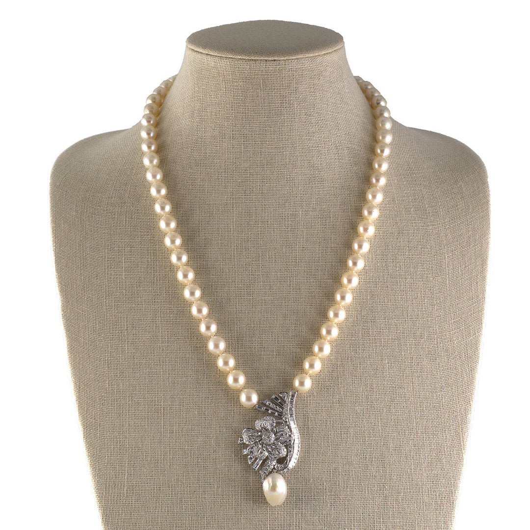 This midcentury showpiece combines lustrous Akoya pearls with a platinum floral swirl pendant set with brilliant- and baguette-cut diamonds. A single baroque South Sea pearl drop adds soft contrast to the structured design.
