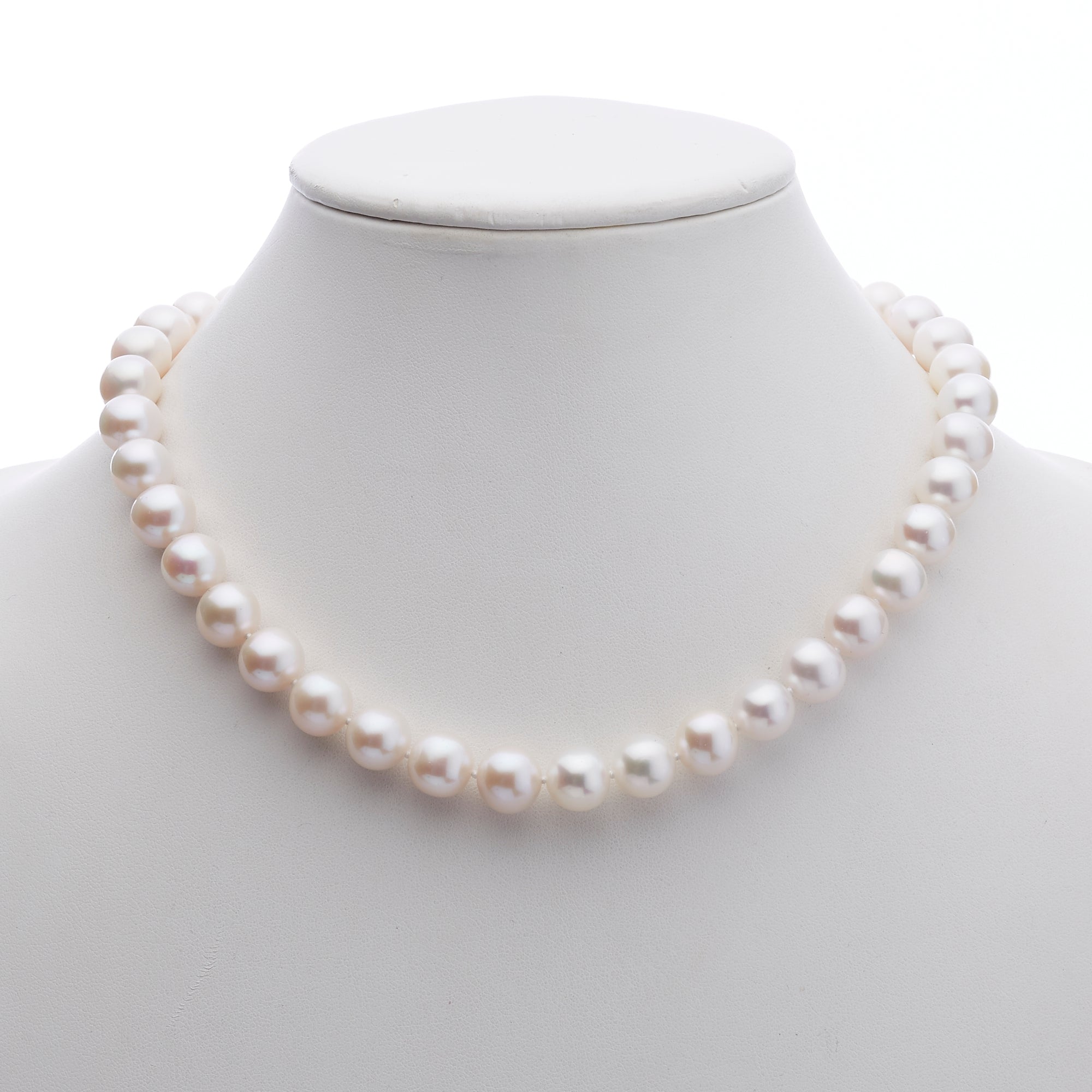 Hand strung of lustrous white freshwater cultured pearls, this timeless choker is finished with a diamond-studded gold clasp. Simple statements of elegance, pearls have been a mainstay in Gump's fine jewelry assortment for decades. Revered for their alluring luster and classic beauty, they are widely recognized as symbols of purity, integrity and wisdom gained through experience. To create this necklace, each pearl is carefully selected for quality, color and shape.