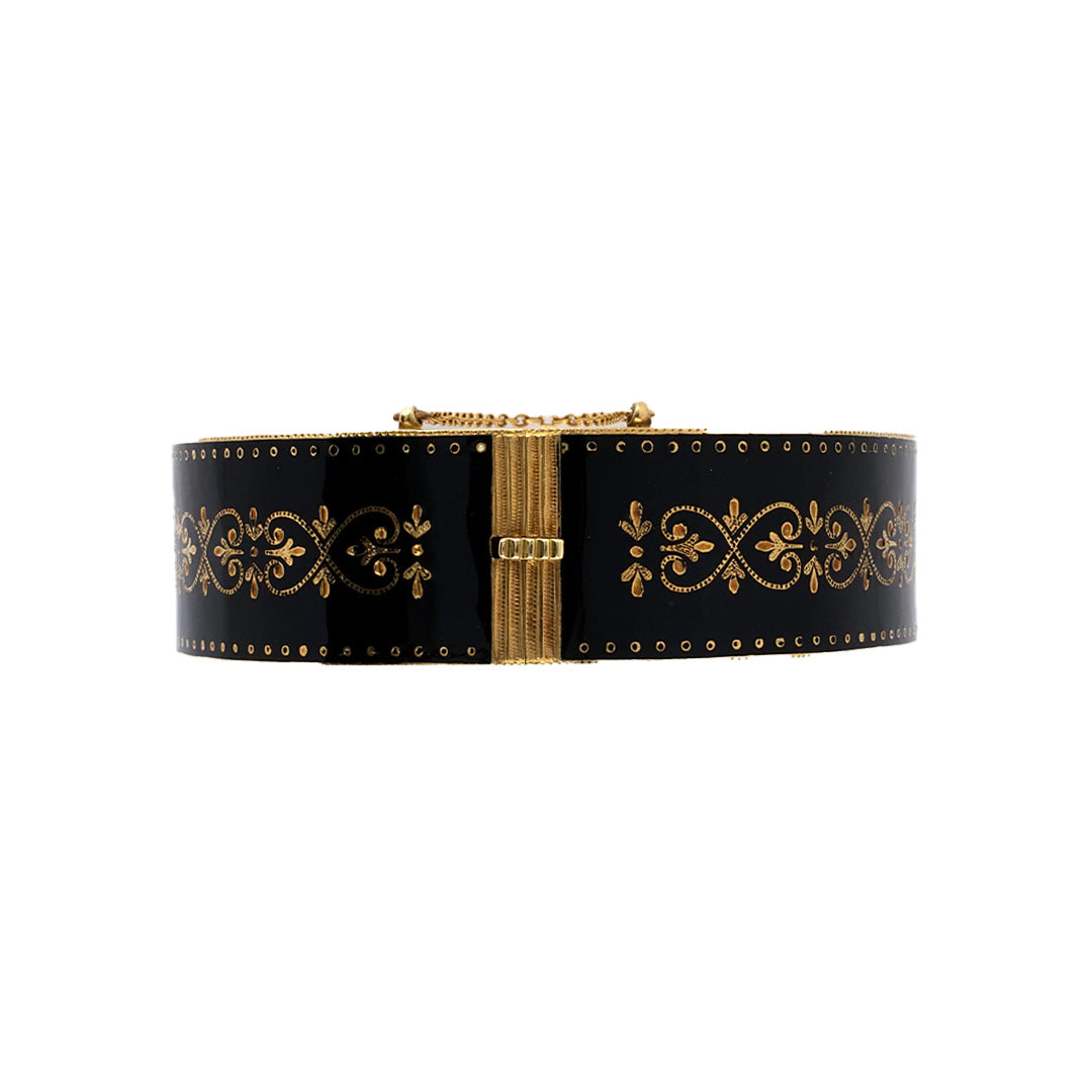 Intricate gold tracery flourishes against a deep black enamel backdrop in this exceptional Victorian bangle. Crafted with precision, it features a symmetrical scrolling motif framed by delicate beaded edges, embodying the elegance and craftsmanship of the era. Gump’s is forever treasure hunting for the best of everything and our collection of estate jewelry — featuring rare antique pieces — is no exception. Distinguished in provenance, each item is one of a kind, reflecting its distinctive gemstones, materials and craftsmanship.