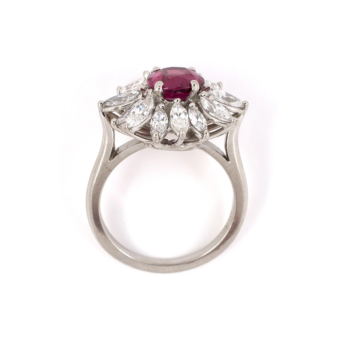 A vivid round ruby commands the center of this platinum ring, radiating outward in a halo of marquise-cut diamonds. The bold sunburst composition exemplifies Albert Pujol’s flair for dramatic settings, where precision meets exuberance in a striking balance.